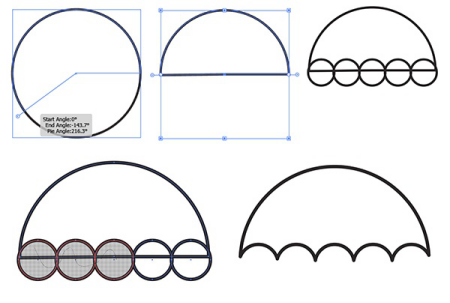 我們的下一個(gè)圖標(biāo)是一把傘。使用橢圓工具繪制圓。使用選擇工具調(diào)整圓的半徑角度,使您有一個(gè)半圓(這是CC 2015功能)。沿著大半圓的邊緣排列五個(gè)小圓圈。使用“形狀構(gòu)建器工具”將它們組合在一起,并從大圓圈中刪除相交的部分。