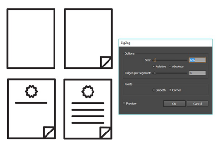 文檔圖標(biāo)非常簡(jiǎn)單。使用矩形工具繪制一個(gè)矩形。在底角添加一個(gè)小三角形。您可以使用鋼筆工具或多邊形工具繪制它。對(duì)于印章,繪制一個(gè)小圓圈并使用Zig Zag效果(效果>扭曲和變形> Zig Zag并根據(jù)需要調(diào)整設(shè)置。在文檔本身上添加幾個(gè)線段用于書(shū)寫(xiě)。