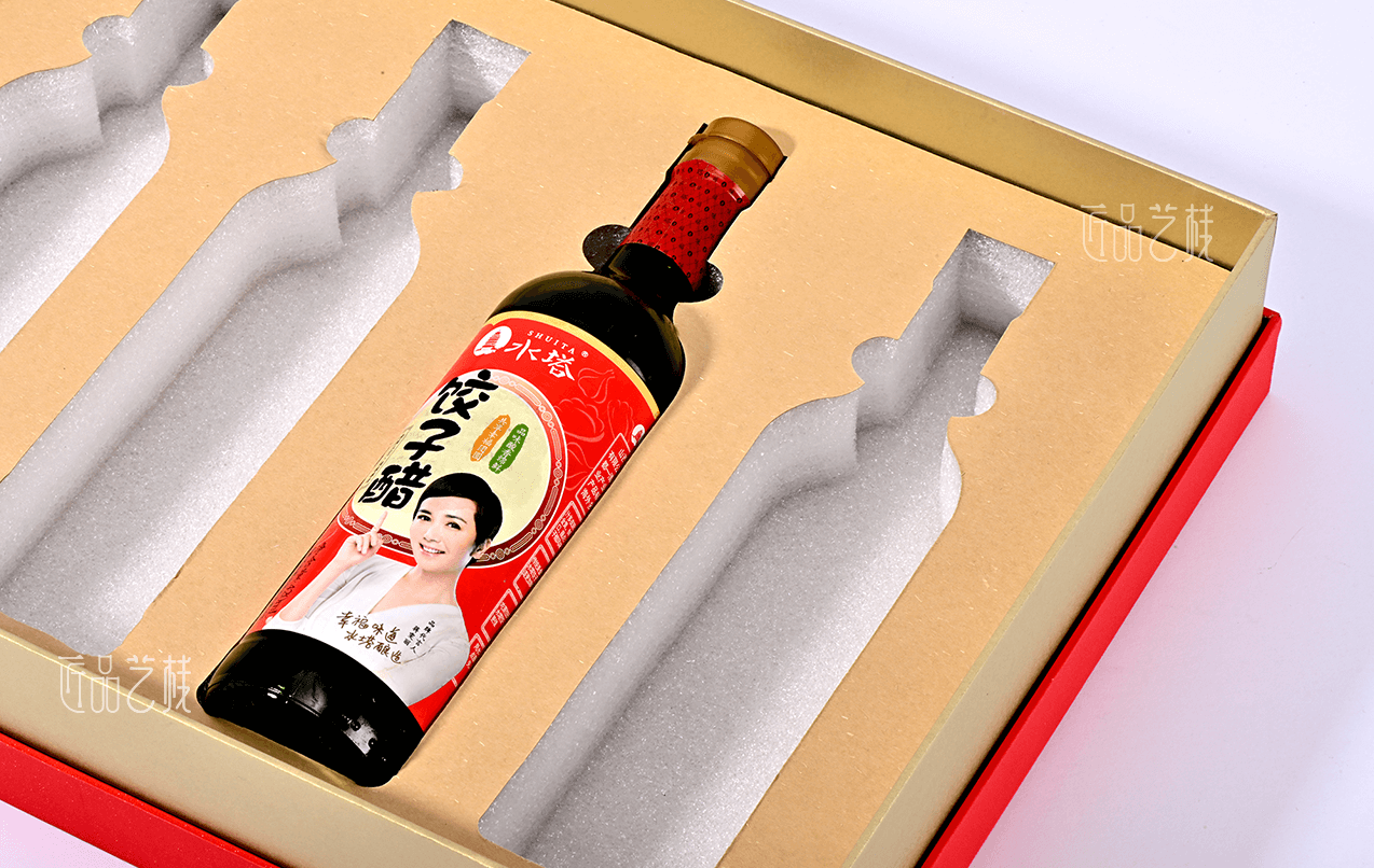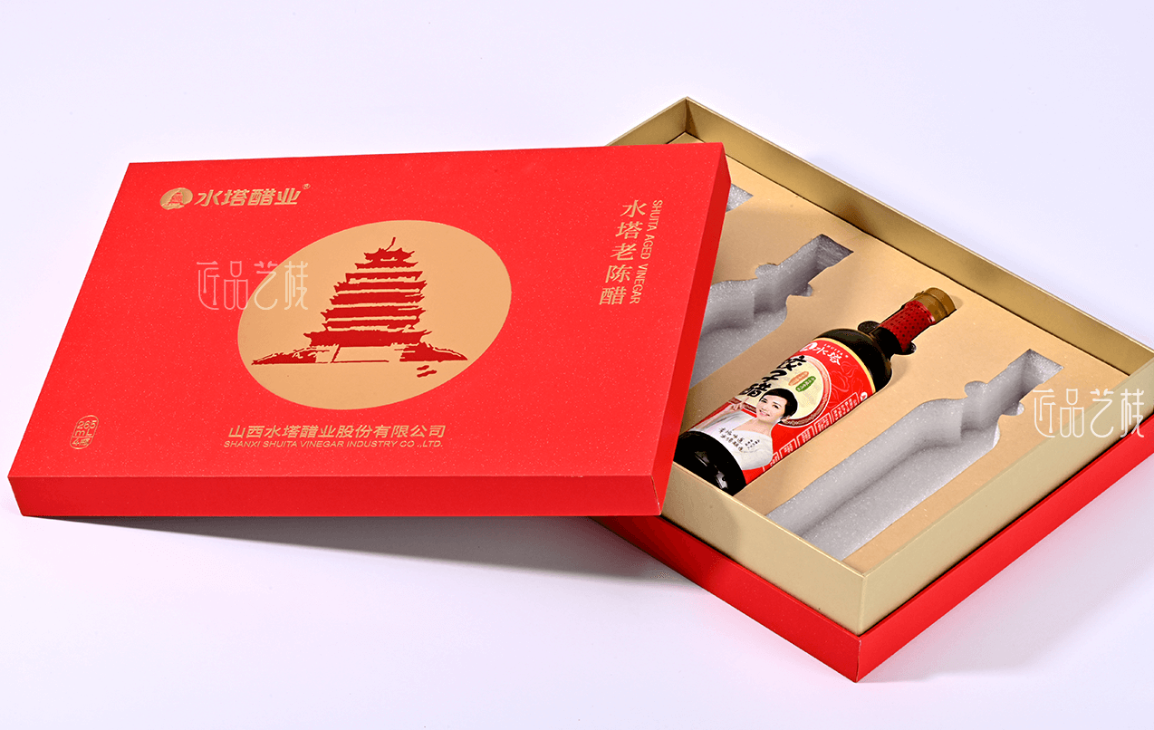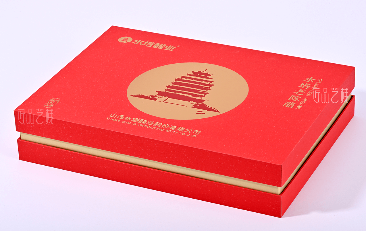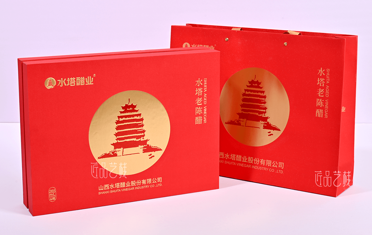 水塔醋業(yè)位于“中國醋都”山西清徐縣,是國家八部委命名的全國農業(yè)產業(yè)化重點龍頭企業(yè),在其包裝盒印刷定制中,采用天地蓋禮盒套裝結構,在中國紅色的面紙上精制細砂與浮雕燙金工藝,搭配枊釘扣手提袋工藝,使整個包裝禮盒呈現出高端、精致的輕奢尊貴體驗感。