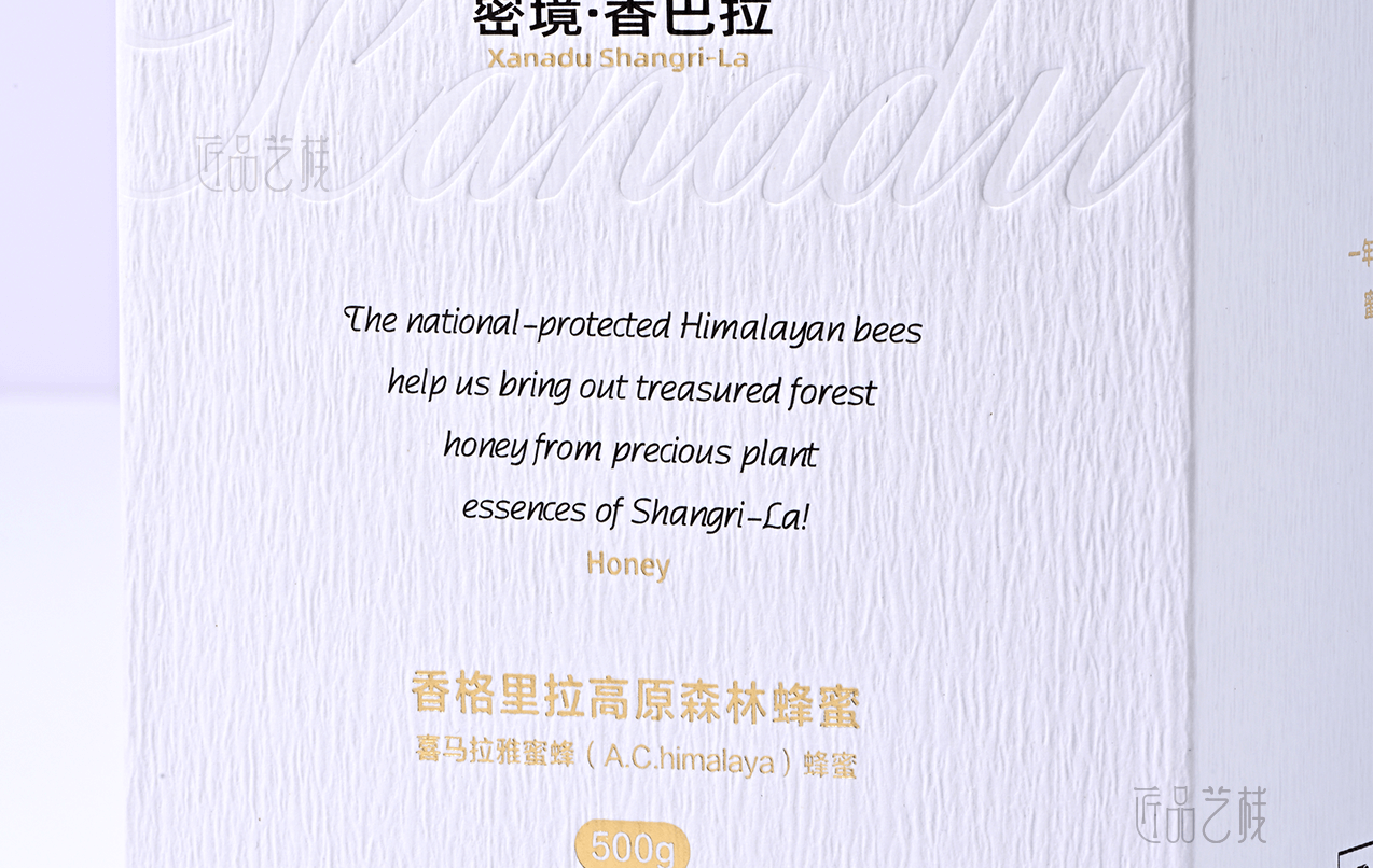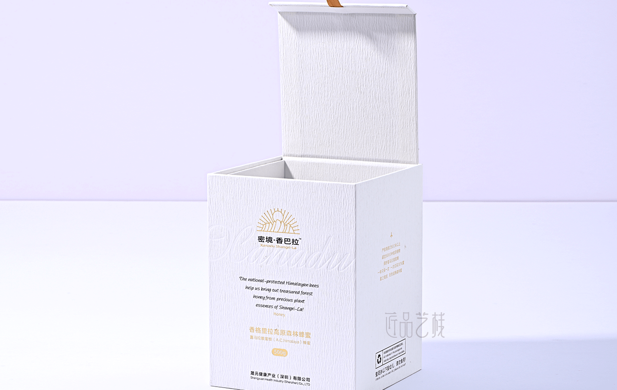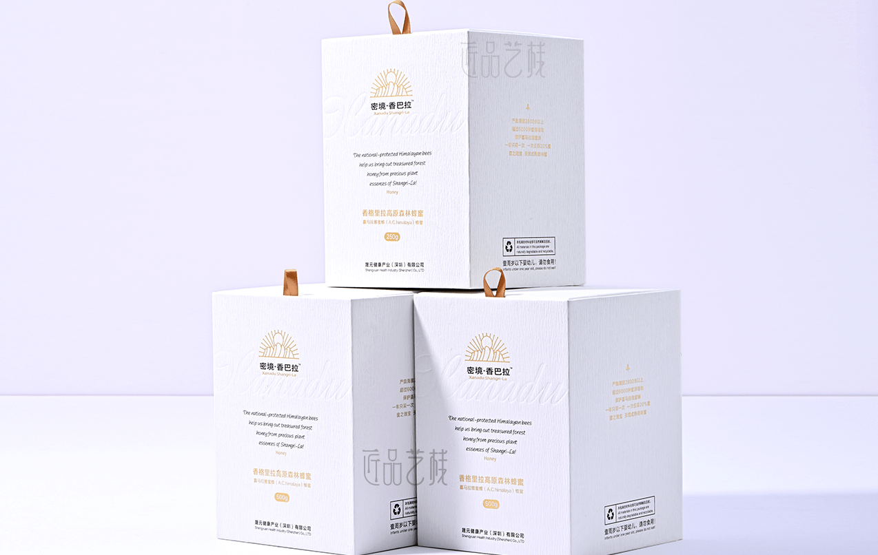 香巴拉品牌蜂蜜,甄選海拔3600米以上的香格里拉深林天然蜂蜜,在其包裝盒定做中,采中純白為底色,襯托其天然、純凈的蜂蜜品質(zhì);同時(shí)點(diǎn)輟燙金等印刷工藝,使該品牌包裝盒呈現(xiàn)出簡(jiǎn)而不凡的氣質(zhì),大力提升香巴拉品牌蜂蜜的市場(chǎng)溢價(jià)能力和消費(fèi)者體驗(yàn)。