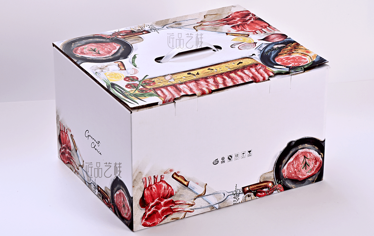 gourmet choice,品牌牛排、牛肉外賣箱,由深圳佳潤隆包裝印刷&匠品藝棧采用白色卡紙精裱雙層瓦楞紙彩色印刷,提供大尺寸包裝紙箱,高端餐飲、牛肉、生鮮、大盆菜等大尺寸彩箱印刷,方便運輸、提升品牌氣質(zhì)與銷量。
