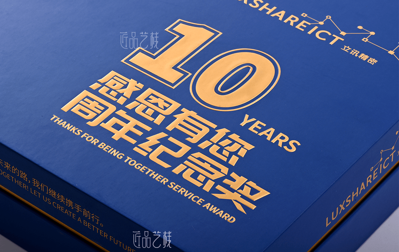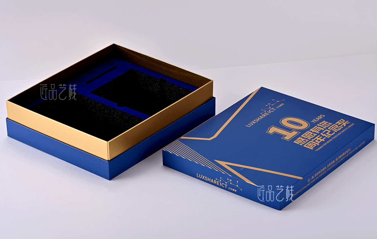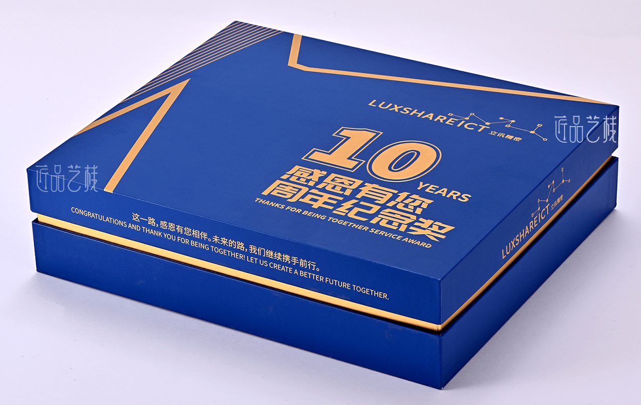立訊精密是一家專注于連接器的研發(fā)、生產(chǎn)和銷售的國家高新技術(shù)企業(yè),今已成為中國大陸排名第一、世界排名第八的連接器生產(chǎn)商,本禮盒為其分公司10周年之際,專屬定制的周年紀(jì)念禮盒,采用海德堡專色印刷、凸金精燙等工藝,結(jié)合金色圍條與天地蓋盒形精裝制作,打造體驗感高檔周年紀(jì)念禮盒。