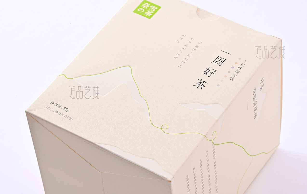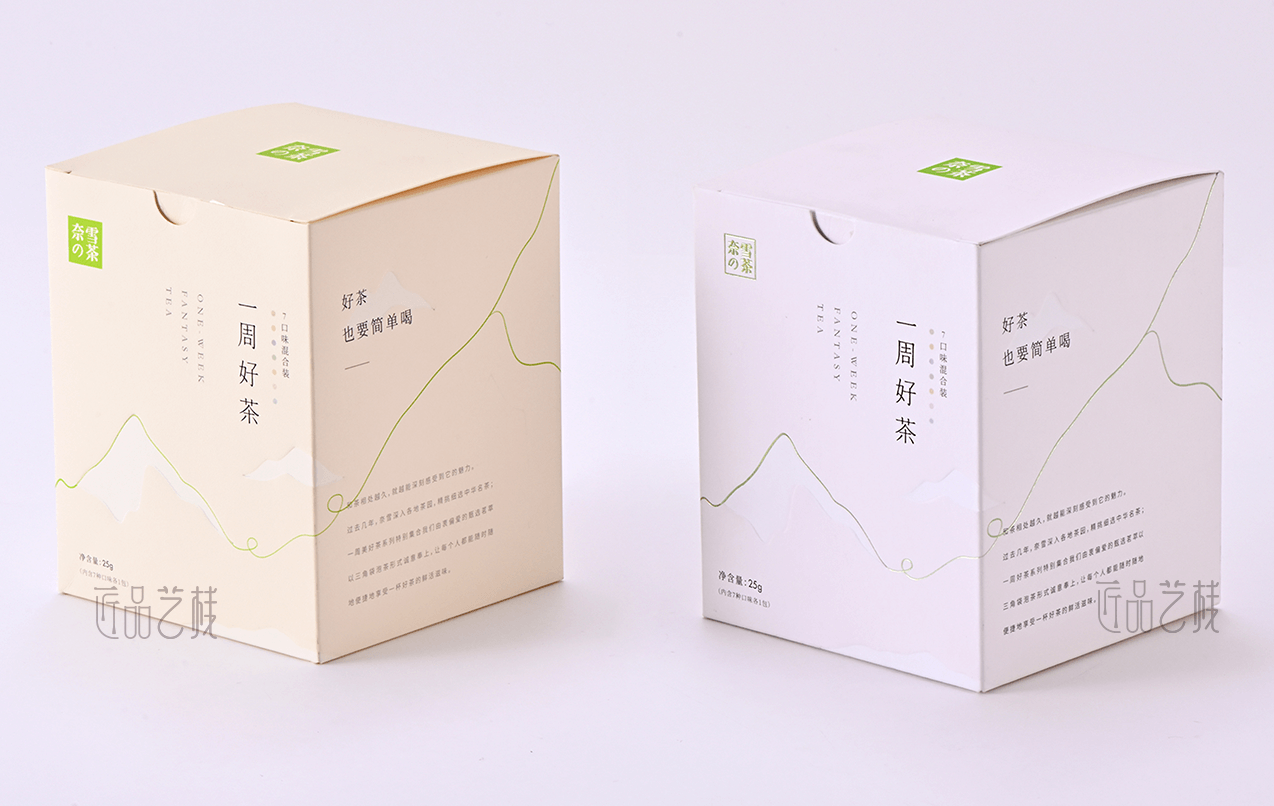 一周好茶,是奈雪的茶特別選擇了深受年輕消費者喜愛的花茶品類,以杯杯專屬新意不重樣的理念,帶來更加專注且豐富的產品升級,在其產品包裝紙盒的訂做上,亦采用簡約新潮的創(chuàng)新紙張,配合簡約的印刷色彩、燙金和凸印工藝,使其呈現(xiàn)出現(xiàn)代簡約、深受年輕消費者喜愛的包裝風格。